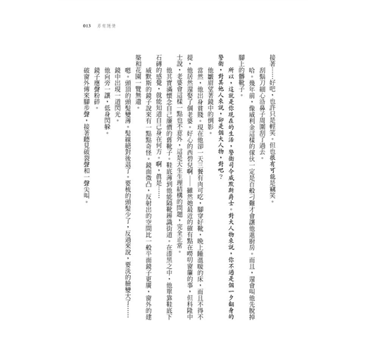 這陣子,有人幫他放洗澡水(每天洗啊!想不到人類皮膚受得了)、有人幫他拿衣服(像樣的衣服!)、有人幫他煮飯(像樣的餐點!他知道自己又變胖了),甚至還有人幫他擦靴子(像樣的靴子!不是紙糊的爛底靴,是又大又合腳、光亮的真皮靴)。諸事幾乎都有人為他打理,但有些事情男人必須自己來,刮鬍子就是其中之一。