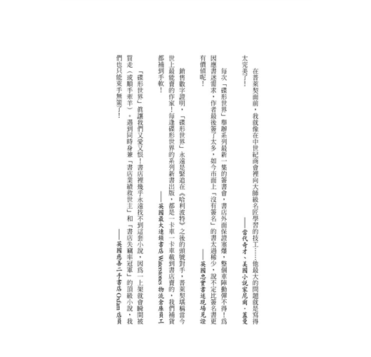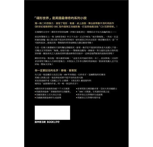★「碟形世界」是英國最傳奇的系列小說。作者獨一無二的想像力,激發了電影、動畫、桌上遊戲、舞台劇等數也數不清的再創作!《新世紀福爾摩斯》BBC製作團隊正改編影集,打造英倫魔法版「CSI犯罪現場」!