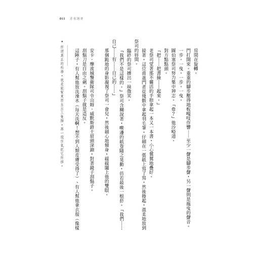「我不明白的是⋯⋯」他說。「為什麼你們老是在這裡或辦公室暗算我。我是說,我常常到處走來走去,不是嗎?你們大可在街上射殺我吧?」