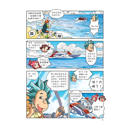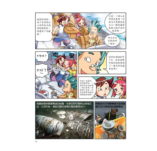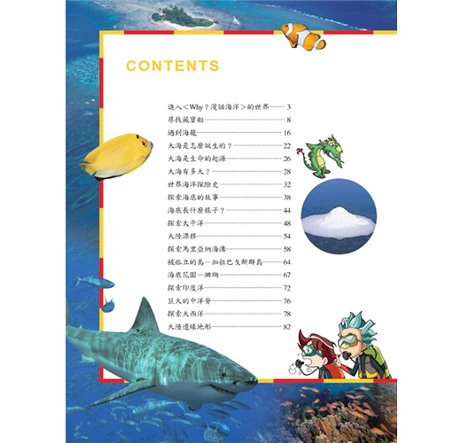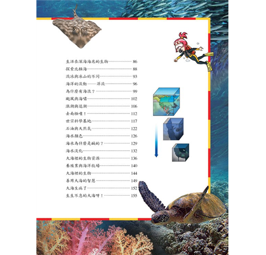 本書帶領小朋友探索世界三大洋、南北兩極和馬里亞納海溝,了解海洋的成因和中洋脊作用、火山和板塊運動;另外,說明洋流和海浪的分別、海水的性質和對生命財產構成威脅的颱風、海嘯的成因,並概略介紹人類賴以維生的經濟魚類和海洋生物的種類,讓小朋友了解海洋與其面臨的危機,建立愛惜資源和海洋的觀念。