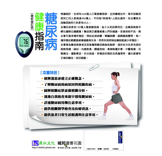 本書內容淺顯易懂,充分利用圖片介紹常用藥物、胰島素抽取與注射技巧,血糖機的操作等,讓讀者們能真正認識糖尿病,完全呈現糖尿病日常生活的因應照護措施。