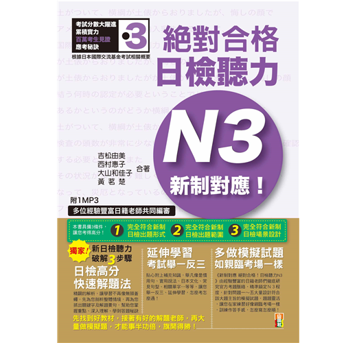 能否聽懂日常生活的談話內容,能否跟日本人溝通,抓住重點,就是新制日檢聽力考試的目的了。聽力最大的問題在:聽一段對話,即使能聽出每個單字,但是無法在瞬間將這些單字結合成句子或段落;因為某些文法而無法聽出完整的對話意思;因為背景知識的缺乏,而無法理解談話內容…等。因此,本書在單字力、文法力、讀解力及背景知識上,精準抓住N3程度,重複強調,讓考生能事半功倍,旗開得勝。