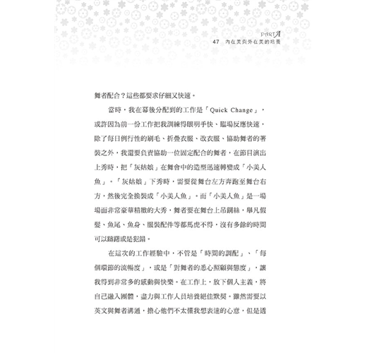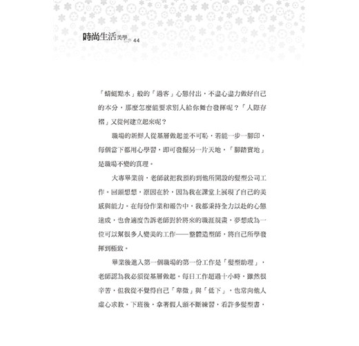 畢業後,先後進入台北兩家知名髮型公司學習,原本想擔任整體造型師的我,之後轉任為行政管理者。在時尚產業中努力工作了五、六年,後來為了實現自己的夢想,鼓足勇氣辭去工作,再接再厲修習「三專在職進修班」,將大學學分修畢。非假日時間,有機會就擔任服裝畫老師、房屋銷售員、迪士尼舞臺幕後服裝組人員。