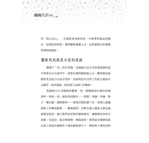 《時尚生活美學──個人形象管理篇》全書共分五大項目:一、內在美與外在美的培養部分,說明了時尚生活美學的真正內涵,真正的「美」是來自生活中的培養,而高昂的鬥志與開朗的心境,可以提升自己正面的能量,紓解壓力,邁向成功之路。二、商業社交禮儀部分,有「居間介紹」應注意的細節與適當時機,凡事貴在用心。交換名片、握手、接聽電話、職場應對進退、網路禮節等合宜的表現,能突顯自己的特色與涵養。三、整體表達技巧部分,認為最基本的溝通技巧,就是學會以「建議」代替批評、適當的尊重與接納、展現傾聽的氣度、發揮聲音的魅力、眼神能展現氣韻等。四、塑造優雅的儀態部分,有坐姿與站姿的正確圖片說明,加上詳細的文字敘述,讓人一目了然。五、時尚保養祕笈部分,教大家巧妙搭配服飾、細心呵護自己的皮膚、謹慎選用合宜的化妝品等。書中內容既充實且合時宜,具有時代的意義與閱讀價值。