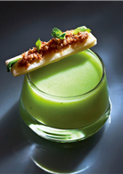 5. 湯碗裡到碗口都噴上薄荷威士忌香精。湯汁倒入碗中,搭配灑上乾火腿末的小塊烤麵包一起上菜。