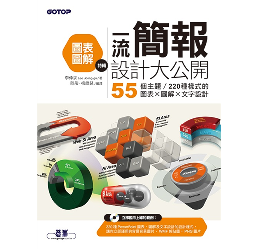 為了表現出質感與技巧,本書收錄了220種PowerPoint圖表、圖解及文字設計的設計樣式,光碟範例亦提供了能讓你立即運用的背景背景圖片、WMF剪貼圖、PNG圖片…等,讓你能快速擁有可在實務中完整運用的必備技巧,在最短時間內,用最好的品質完成簡報。