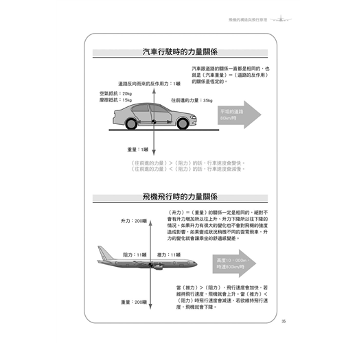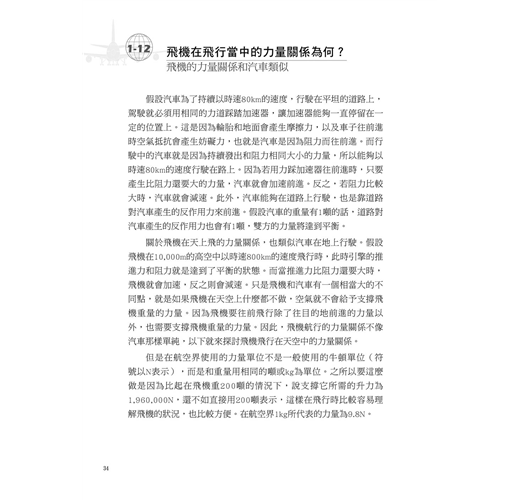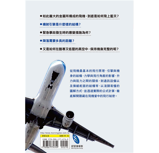 從飛機最基本的飛行原理、引擎與機身的結構、力學與飛行角度的影響、升力與阻力之間的關係,到通訊設備以及操縱舵面的結構等,以淺顯易懂的圖解方式,並透過實際的公式計算,徹底解開隱藏在噴射客機當中的飛行秘密。