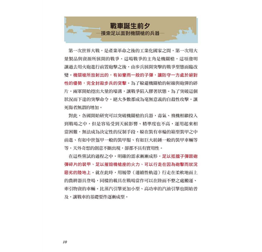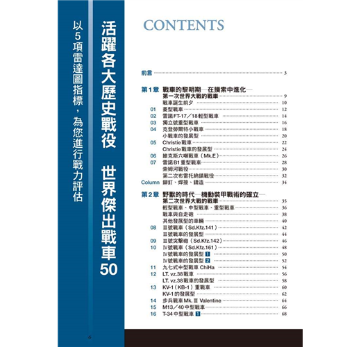 本書從戰車歷史中挑選出50 輛具有革命性意義的車種,以硬體的解說為主,配合該戰車活躍的戰役,以及相關的技術性手法。希望讓各位在欣賞戰車的同時,也能更進一步了解在戰車背後,一個國家對於戰爭所抱持的方針。