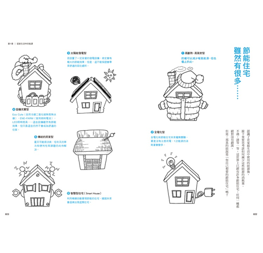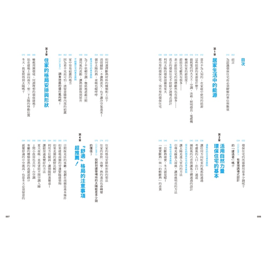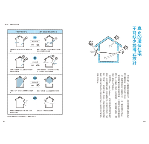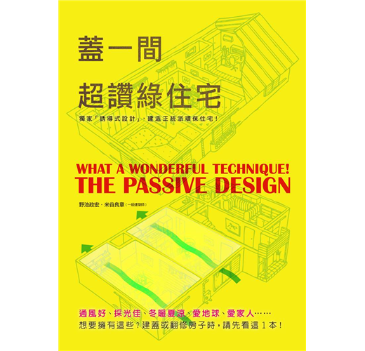 所謂的誘導式設計,是指充分了解太陽和風的性質,藉由巧妙地引入或遮蔽它們並結合在住家設計中,為居住在裡面的人帶來自然力量的「溫暖」「涼爽」「明亮」的設計巧思。書中就以大篇幅介紹這個誘導式設計,讀者一讀本書之後,必會了解它的重要性及方法,將這個設計法加入建造或改建的過程中,設計出好住又環保的家園。
