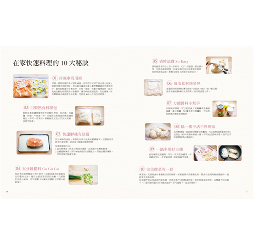 《快速料理10大祕訣》5分鐘備料Go Go Go,省時法寶So Easy、搖一搖不沾手料理法、一鍋多用好方便、超完美快速料理流程、Super快速解凍法…