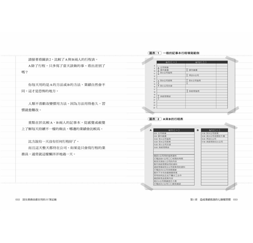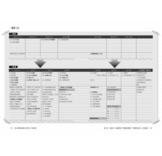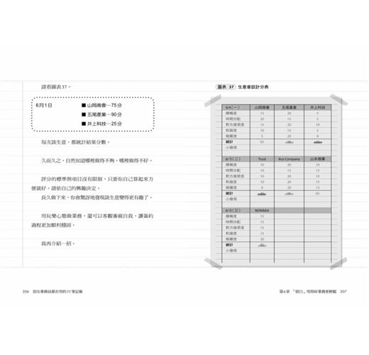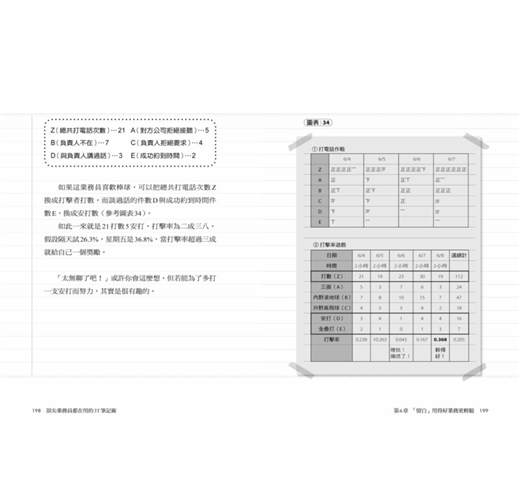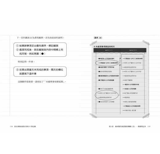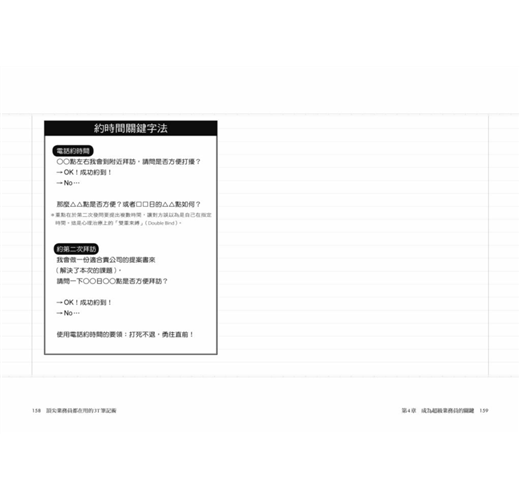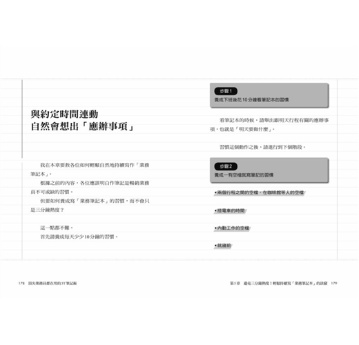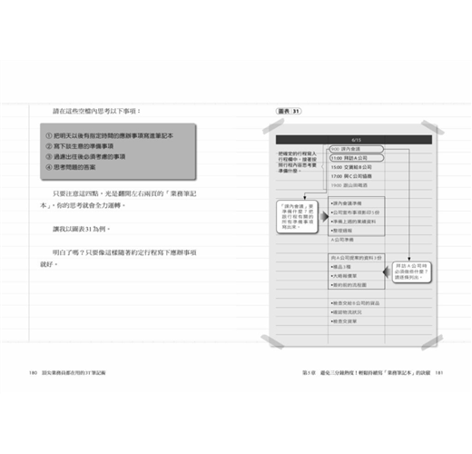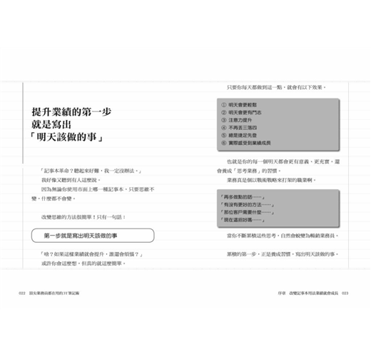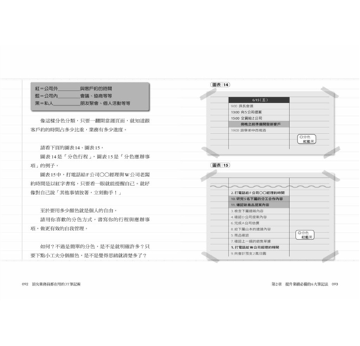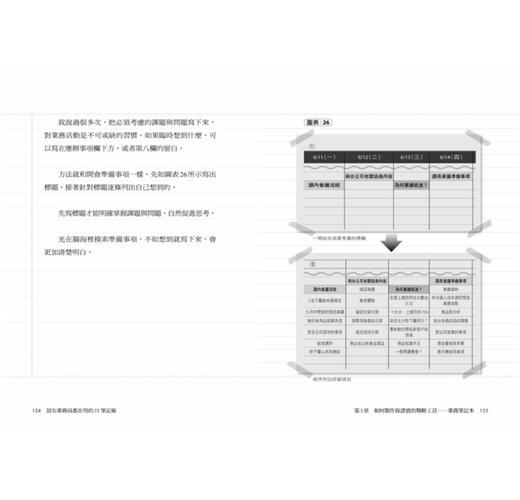 這個透過「規畫—準備—思考」三步驟和逐一條列的邉寫邊想業務法,最主要是讓你養成「思考業務」的習慣,強化你的「安排力」,從日常事務與客戶回應中串起線索,找到解決問題的方案,清楚看到完成目標必須做到的大小環節、事半功倍的時間管理法,以及幫助銷售提振業績的觀念、方法與訣竅,例如: