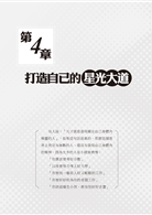 ●教你打造夢想方程式:天賦、熱忱、市場為主要三大要素,加上瘋狂的努力,找到貴人相助,隨著自己的心,每個人都有屬於「自己的星光大道」,這並不是說所有人都要成為萬眾矚目的巨星,而是都應該找到自己樂在其中的生活方式。