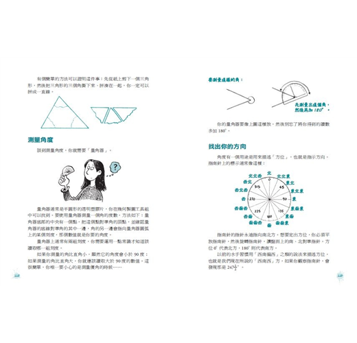 作者在編寫本叢書時,一直把握幾個原則:不使用複雜的計算,不使用精巧的儀器,盡量動手做。像書中要證明三角形內角和為180∘,用撕紙的方式就完成了。小讀者們長大後,對於書中所提過的數學名詞必定毫無畏懼!