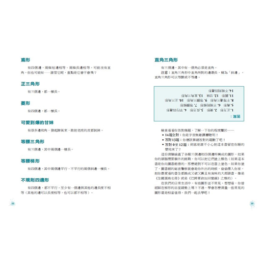 對於數學名詞與觀念的解釋,力求簡單扼要,難度適中,中高年級的孩子可以自行閱讀學習,也是老師和家長教學上實用的資料庫與靈感來源。