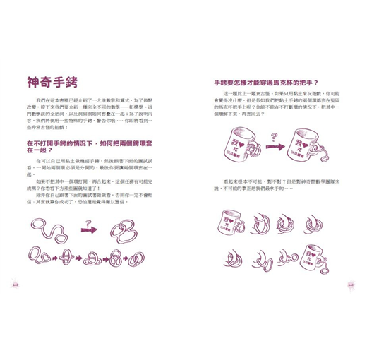 就主題來說,本套書包羅萬象,包括算術、錢幣制度、級數、平均值、分數、質數和幾何,囊括了國小數學最簡單的內容(如加、減、乘、除)和最複雜的概念(如拓撲)。因為設定的讀者是小學中年級到高年級的學生,內容必定是以基本的概念為主,並力求說明清晰簡單;但即使是像我這樣的大人,也可以由書中獲益。例如我在小時候學習算術時,只知道照著老師教的方法依樣畫葫蘆,知其然而不知其所以然,但是本書作者對每一個計算步驟都做了詳細的解釋,使人真的了解其中的用意,也讓我對以前學過的數學主題有了不同的體悟。對於複雜的概念,當然不可能對小讀者們介紹太困難的內容,但在作者的精心設計下,小讀者們仍可以在玩遊戲和變魔術的過程中「享受」這些數學概念。
