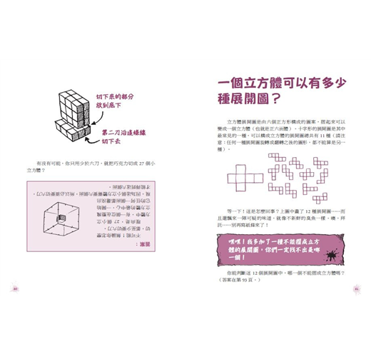 那麼「神奇酷數學」呢?我們來看看它如何證明三角形的三個內角和是一百八十度。書裡說,你可以在紙上任意畫一個三角形,再拿剪刀把三角形剪下來,然後撕下三個角並湊在一起,看看會不會產生一直線。這樣的實做經驗,比起正經八百的證明,更能震撼學童的內心。這套書中還有許多經由實做就可以領會的幾何定理,就算複雜如巴斯卡定理,小讀者都可以在愉快的閱讀中領略幾何之美。
