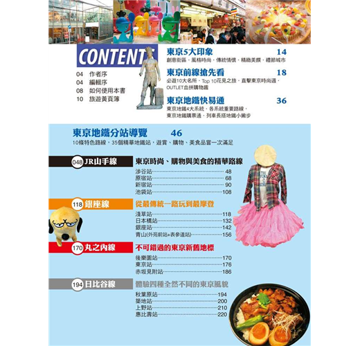 從「東京地鐵4大系統」開始詳盡剖析,輕鬆了解東京地鐵的分佈與分類,及其所行經街區的特色。而在「東京地鐵購票通」裡,則說明各票券的差異與價格,讓旅人可以選擇最實惠的方案。至於「列車長搭地鐵小撇步」以STEP BY STEP方式告訴你如何解讀列車告示牌、列車過站不停的原因、時間的掌控、電車禮儀......等貼心叮嚀。
