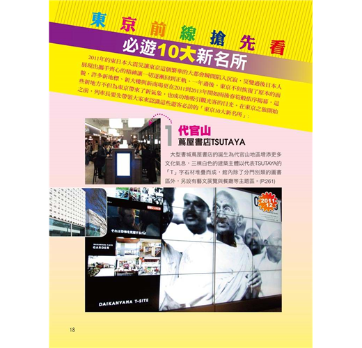 四大專題報導整理出旅客最感興趣的東京資訊,「東京十大新名所」將2011年底至2013的東京新地標如晴空塔、涉谷HIKARIE、原宿TOKYU PLAZA、新東京車站等一次收錄;「東京Top 10花見之旅」告訴你作者心中的10大賞櫻勝地,從復古風情、划船賞櫻、櫻下野餐到夜櫻宴飲的不同特色地點全部收錄; 「東京時尚前線」帶你了解令人好奇的東京時裝週盛況,並提供各項即便是遊客也能參與的時尚活動;「東京OUTLET血拼」為你分析東京近郊各大暢貨中心的特色,讓您開心購物收穫滿載!