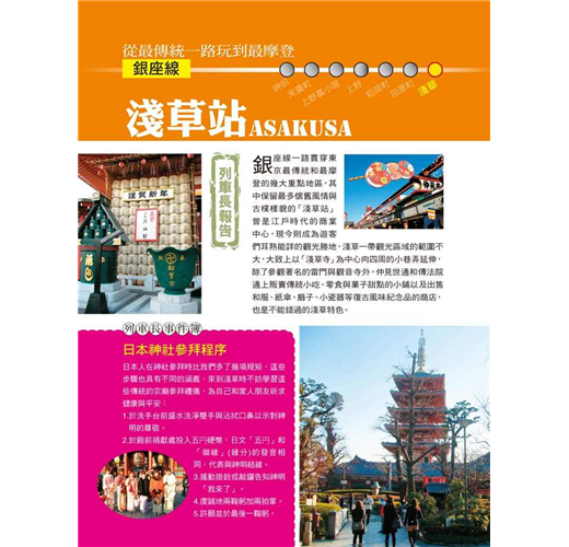 介紹堪稱是新與舊交接點的銀座線,可以讓人傳統一路玩到最摩登,其中以「淺草」、「日本橋」、「銀座」、「青山 (外苑前站+表參道站)」4大站為主。