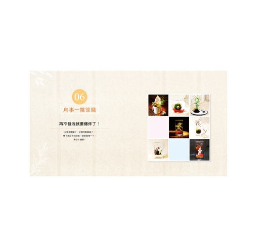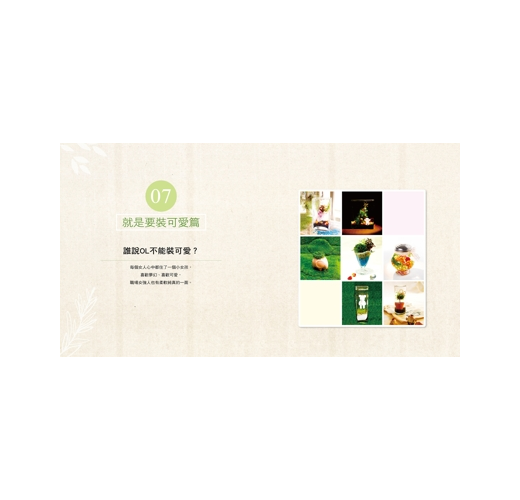 根據上班族的10種心情,創造70盆情境水草小盆栽,如白日夢篇、下班放鬆篇、好想度假篇、鳥事一籮筐篇、就是要裝可愛篇、小資女省錢篇等等,搭配趣味對白,幫你把心聲說出來!