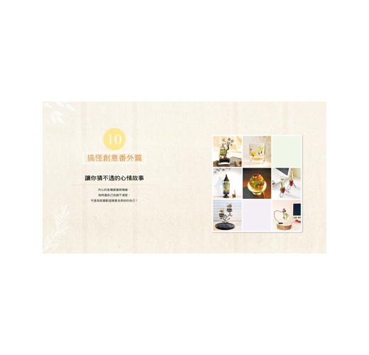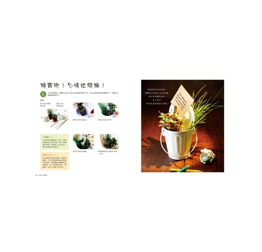 內含園藝治療基礎知識,教你如何成為自己的園藝治療師,遠離憂鬱,保持好心情;還有豐富的水草知識,教你簡單養水草,隨時依心情喜好替換,長保盆栽新意。