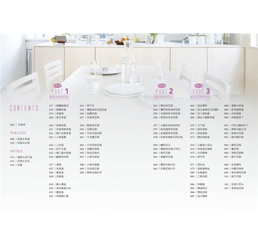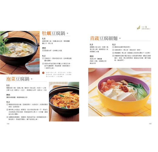 本書中不僅介紹140道極受歡迎的家常好菜,還教讀者自己做豆腐、豆漿、豆花、蛋黃美乃滋等,還有一些料理上的私房小撇步,