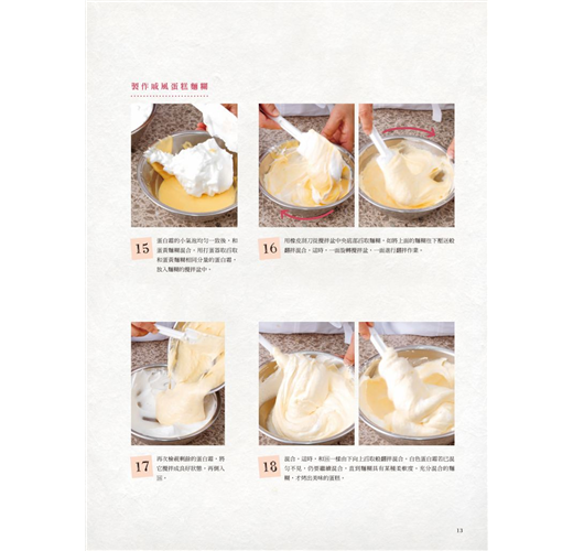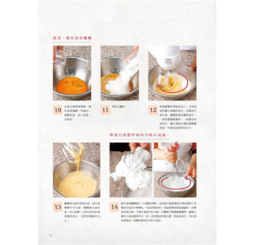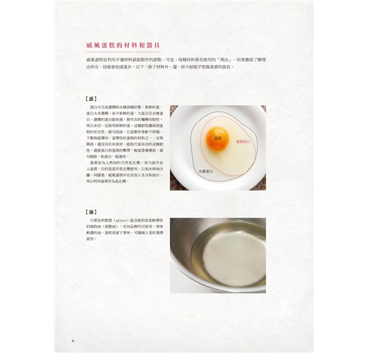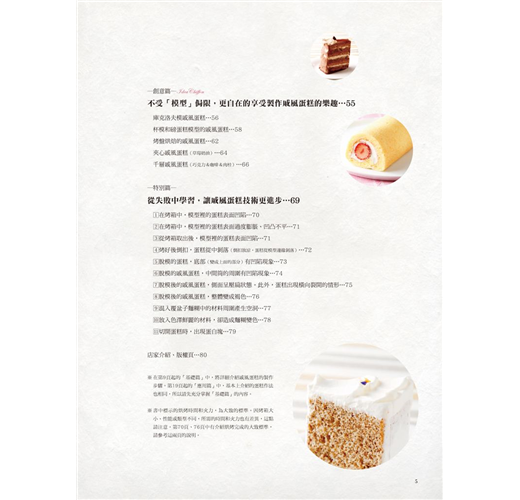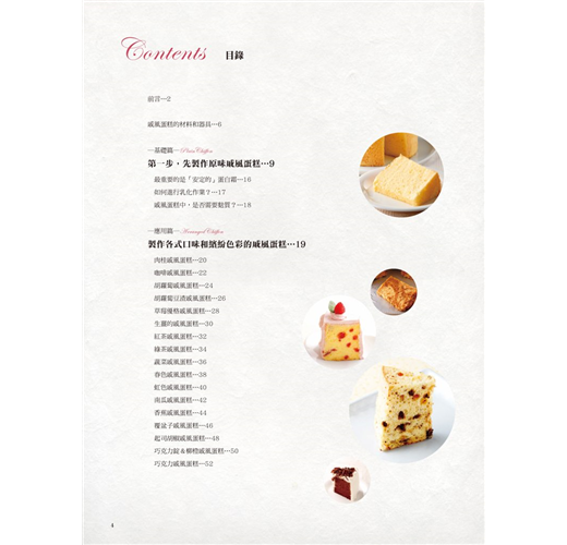 本書分為基礎篇、應用篇、創意篇、特別篇,讓您由淺入深循序漸進,成功烘焙出各式風味的戚風蛋糕。尤其是在「特別篇」裡,收錄11則常見的戚風蛋糕失敗實錄,為您解答原因及解決方法!