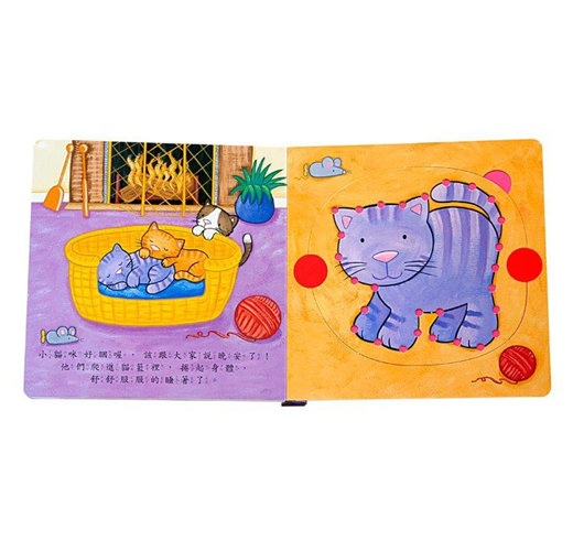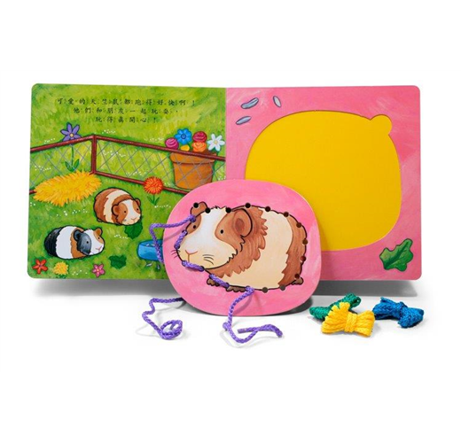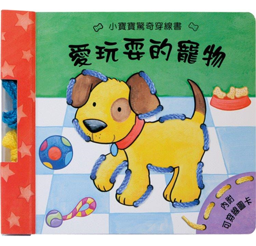 快來和可愛的寵物寶寶玩玩有趣的圖卡穿線書!輕輕取下動物圖卡,再用鮮艷的彩繩為他們鑲上美麗的花邊吧!本書附有綠色、紅色、黃色和藍色共四條彩繩。教育功能:★強化幼兒手眼協調能力。★促進幼兒手腕動作靈活運用。★兼具娛樂與教育功能。