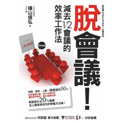 橫山信弘的新作《脫會議!減去1/2會議的效率工作法》提供了看待會議、組織會議、主持會議及參與會議的諸多嶄新觀點與思惟,惟有能把會開好,再來召集會議,不然就是浪費資源,更嚴重的還浪費生命,完全無助企業成長及個人發展。作者取名「『脫』會議」當然重點強調,要降低會議召開的成本及提高會議結論的效益,但是,我個人的拙見倒認為這「脫」字取得妙,有種超越的意涵,也有改頭換面的隱喻在其中,透過本書,讓我們超脫過去會議召集的迷思,嘗試改變會議的風貌,試圖產生不同以往的效果。
