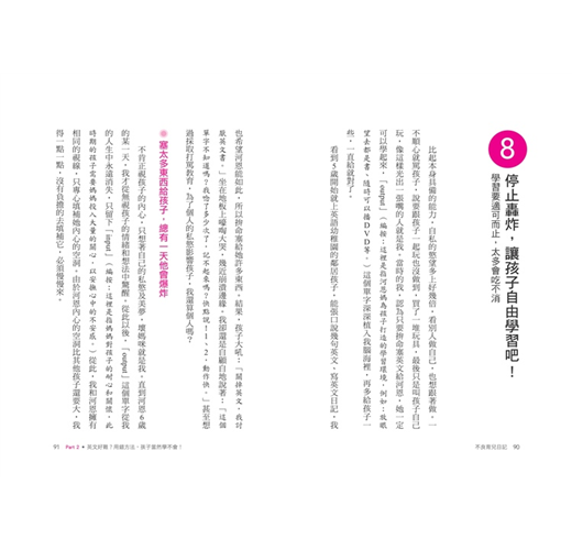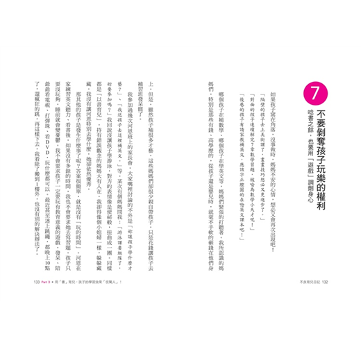 生活並非一定要浪費在貴到像在搶劫的益智玩具上,幼兒教學課程、補習班等,也無法保證孩子未來的成功。被時間追趕,被作業追趕;被進度追趕,被考試追趕;被洪水般來襲的期望感追趕,這不就是變相逼孩子過著與其他人不同的生活嗎?請仔細想想,什麼才是讓孩子開心、變開朗的原因吧!