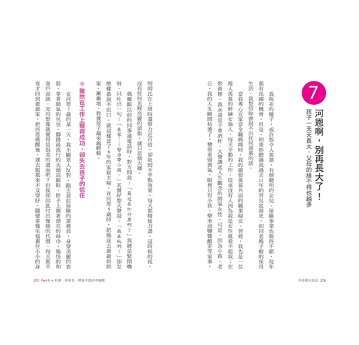 世界上沒有白吃的午餐,育兒也是,妳對孩子付出多少努力,他就成長多少。教養書中常說「放輕鬆帶孩子吧!」這句話不是叫妳什麼都不管,而是要請妳「全心投入一件事並向前邁進,剩下的就放寬心」。為了做好「帶孩子」這件事,妳必須吃苦耐勞,盡心盡力,為自己加油,片刻不休息的往終點奔馳。既然如此,就盡情享受吧!忘卻痛楚的翱翔其中吧!