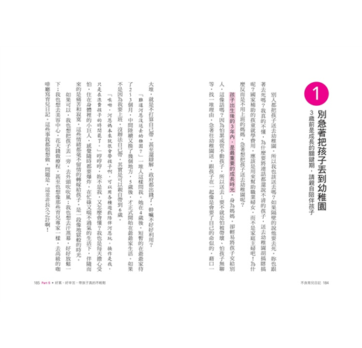 每當我在照顧河恩上遇到麻煩,感到空虛、苦惱時,與其胡思亂想,倒不如從書中找答案。反覆思量,找出適合自己的解決方案。不看書的媽媽沒有當「媽媽」的資格,不要把「沒時間」當藉口,時間的價值在於「投入和集中力」,試著用心感受並實際行動吧!
