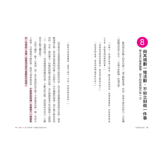要讓孩子打發時間時,請不要拿出手機或IPAD,請給他一本書。因為一旦讓孩子習慣強烈的聲光效果,之後就只能用更強、更激烈的產品,才能滿足孩子,他當然對書沒興趣,又怎麼可能會想看書度過時間呢。當然,偶爾也可以幫書換換封面,裝飾一下,保持孩子對書的興趣,也是個好辦法喔!