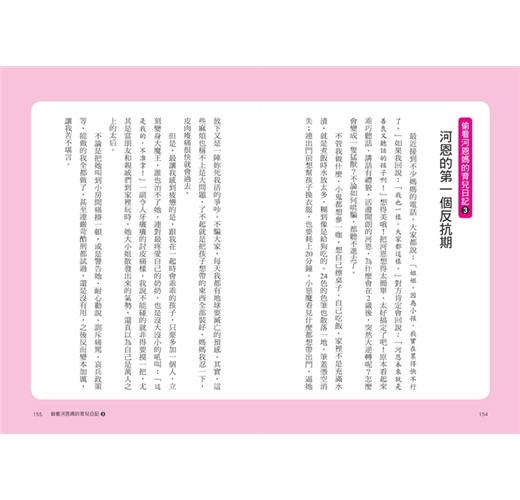 處於反抗期(18~36個月)的孩子,只有媽媽才能承受得住?這到底是誰說的?從1歲開始,妳會開始發現,孩子變得非常有趣。話說河恩在反抗期時,真的非常丟人,如果她去參加「我的孩子變了」節目,收視率大概會暴衝吧!因為當時她就是打死也不聽話,就算只在一旁看,都很想掐她。