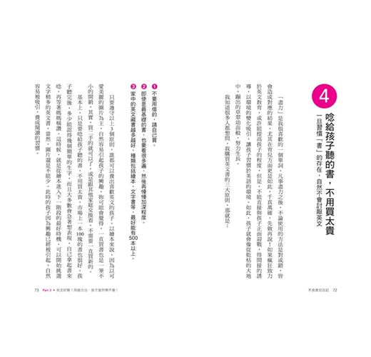 這是重點,千萬別等孩子主動問時才行動。要趁孩子不注意時,利用身高上的優勢,主動拿起英文書靠近孩子,若無其事唸給孩子聽,用活潑的語氣引起孩子的注意力。只要持續不間斷的做,孩子的發音絕對會跟著CD中的聲音走。
