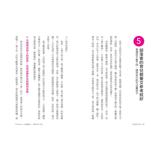 最後,我開始從育兒書裡找答案,不管是標題還是廣告,只要看起來能舒緩我的痛苦,就算只有綠豆般大小線索的書,我都會買回家閱讀。像是《無微不至的愛》(呃~)、《生氣的父母毀了孩子》(這……)、《孩子因為媽媽99%的努力而成長》(暈~)、《內心的不幸》(這才對嘛!)等。比起學習如何教出天才,還不如鑽研那些成功媽媽們在帶小孩時,如何穩住及克服情緒的方法還實際些,我只需要專注這部分就夠了,對育兒來說,重要的不是方法或技術,而是妳如何「應用」。因為每個人適用的方法都不同,只要最後能解決問題就可以了。