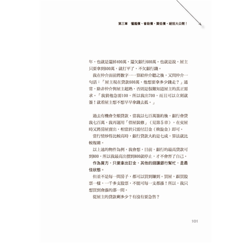 我在八年間,從第一間屋子開始,陸續買賣了四百間房屋,我發現,在買屋的同時就想到賣屋,未來賣屋時就更加順利,避免「買錯屋懊惱,賣不出去悔恨」的情形。