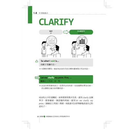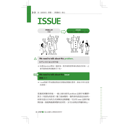全書嚴選60個在商場上常用來表述個人立場的單字,並以漫畫式的插圖輔佐,比對意思相近的單字,讓讀者能快速地掌握精準的用字。舉例來說,『我們正面臨了一個重大問題或困難』這句話,許多人在翻譯時都習慣翻成: