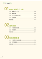 本書針對初學者編撰,將目標鎖定在Flash各功能的認識、應用乃至熟練,以淺顯易懂的範例教學,引導讀者以循序漸進的步驟快速上手且融會貫通。待讀者熟悉工具面板、時間軸、圖層、影格與遮色片效果的使用,以及補間動畫、骨塊工具、3D功能的設定、ActionScript語法應用,最後介紹動畫腳本設計,從無到有完成自己專屬的創意動畫作品。