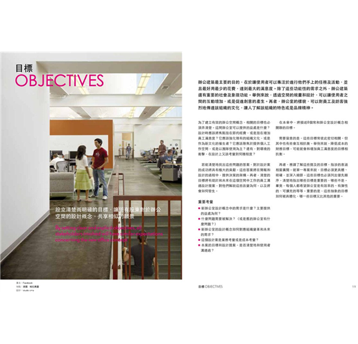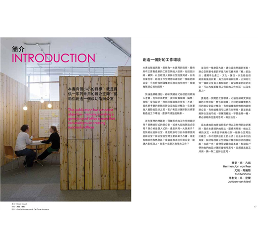 這本書的目的是協助客戶們以及他們的設計團隊,藉由本書提供的想法、靈感和規範,做出正確的決定。本書並不偏好任何一種辦公空間設計概念,亦不提供設計上的公式;而是以中立的角度,探討每種辦公空間設計概念和形式的優缺點。如此一來,我們希望藉由這本書,幫助客戶們和他們的設計團隊審慎地思考,並創造出真正好用、獨一無二的辦公空間。