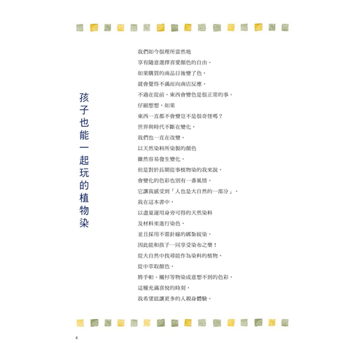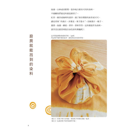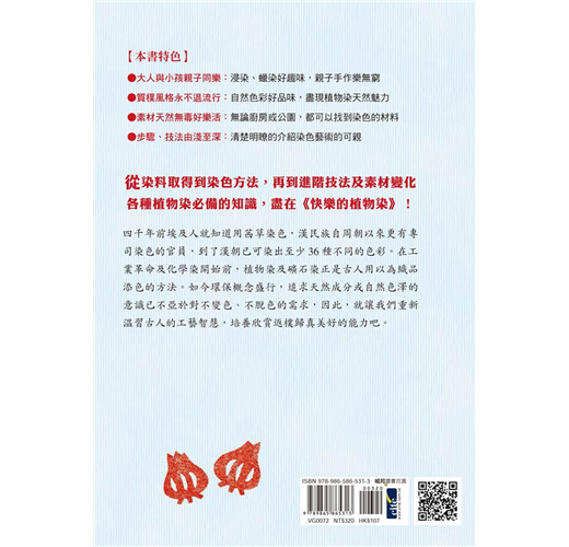 四千年前的埃及人就知道用茜草染色,漢民族自周朝以來更有專司染色的官員,到了漢朝已可染出至少36種不同的色彩。在工業革命及化學染開始前,植物染及礦石染正是古人用以為織品添色的方法。如今環保的概念盛行,追求天然成分或自然色澤的意識,已不亞於對不變色、不脫色的需求,因此,讓我們重新溫習古人的工藝智慧,培養欣賞返樸歸真美好的能力!本書一開始從廚房講起,說明如何以廚房隨手可得或一般生活常見的食材作為染料進行染色。接者將範圍括大到社區公園、山林步道,介紹大自然中能夠作為染料的植物。 染色技法方面,從最簡單的浸染到刷染、絞染、蠟染、拔染、夾染都有示範,其中以橡皮筋代替針縫來綁紮絞染的技法,是最適合與小朋友一起玩染色的。