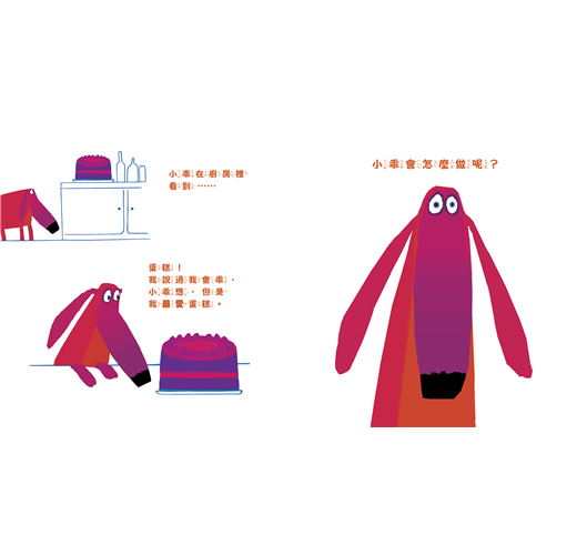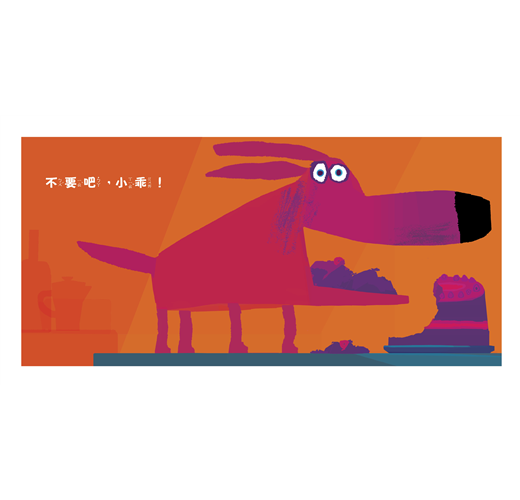 「克里斯霍頓的新書中,主角小乖是一隻有大鼻子、垂耳朵,和一張無辜臉的小狗,他的身體由紅色及紫色的飽和色塊組成,他的主人哈利,長得像小魔怪,同樣也用飽和的色彩塗成。小乖雖然和主人保證不會搗蛋,但主人一離開,小乖馬上被許多東西誘惑……(蛋糕!我說我會乖,可是我最愛蛋糕了!)。在這個幽默的故事中,作者刻意安排小乖傻傻的看著觀眾,接著問:『小乖會怎麼做呢?』,然而這個『暫停』會馬上會被打斷!因為下一個跨頁,我們就可以看到小乖如何失控,再搭配上旁白誇張的喊著:『不要吧,小乖!』。經過小乖幾個錯誤的判斷後,在哈利面前等著的,是亂七八糟的景象,究竟事情會如何發展呢?這個傻狗狗的故事不僅令人喜愛,更再度讓我們看見克里斯霍頓的創作天賦!」