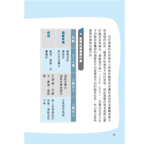 由於過敏的症狀會由小時候的腸胃和皮膚的表現再逐漸轉成鼻子和氣喘的症狀,隨著年紀會有不同的表現,因此過敏的學者都將這樣的臨床表現稱為「過敏進行曲」(Allergy March)。其實這也表示在不同階段接觸到的過敏原不同會導致不同的臨床症狀,所以要注意和處理的事情也就不同。