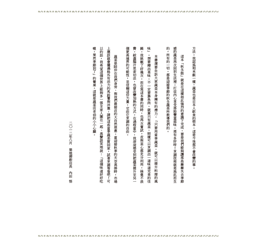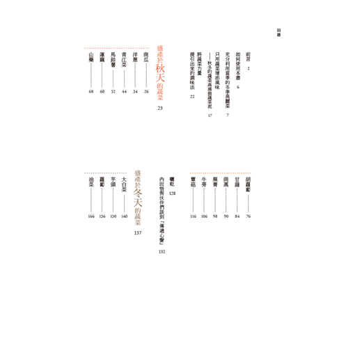 這是本讓人值得握在手中渡過秋冬的溫暖小讀。每道料理簡單又細緻,令人驚豔的是,每樣食材裡蘊藏著不為人知的烹調技術,有著讓人想立刻放下書本試做的小技巧,這就是它溫暖的吸引力。──914