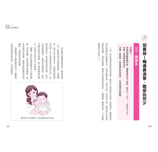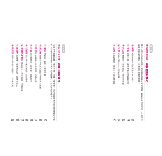 從腸胃、感冒、皮膚、日常護理、五官、補益、急救等7個層面,針對身心常見疾病,提供對症調治老偏方,幫助寶寶強身健體,提昇免疫力,健康成長。