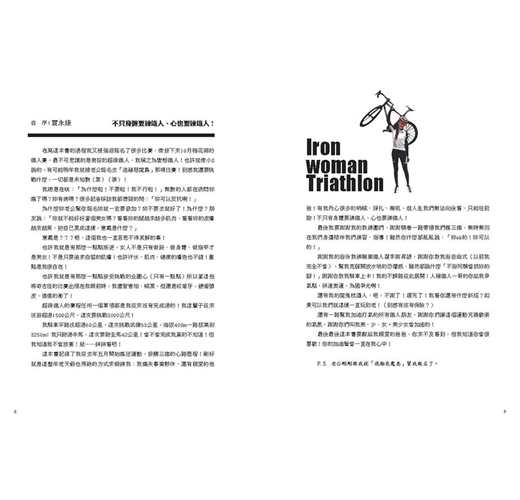 ◎從6公里的路跑都難以跑完,到挑戰冬山河接力、獨力完成碧潭三鐵、帶著國旗游過紐約哈德遜河……51.5公里的瘋狂,到超級鐵人226公里的終極夢想,她讓我們看見,夢想,沒有不可能!