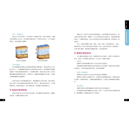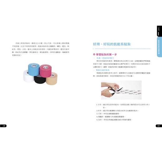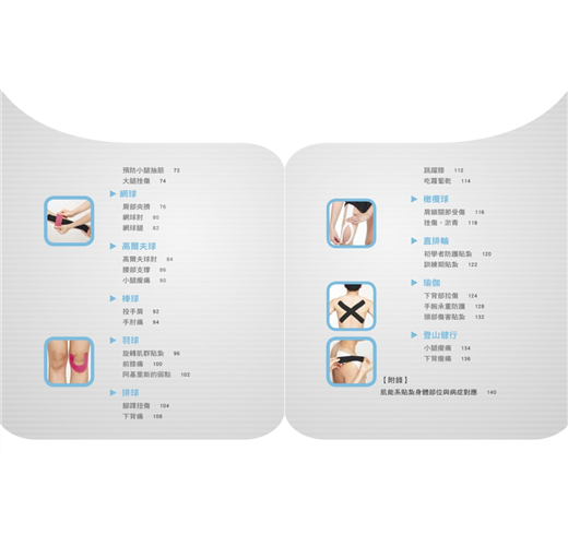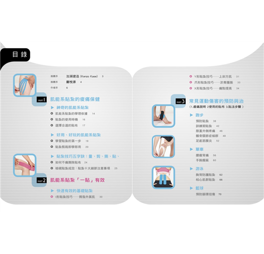 後來,慢慢有些外地的病人希望可以教導他們自行貼紮,以減少舟車勞頓之苦;也有病人擔心出國自助旅遊時發生意外,也希望可以教他們一些常見的貼紮方法。讓我產生了出版這本圖解書的想法!當然,肌能系貼紮不是只能用在運動防護,在臨床上,如:中風、腦性痲痹、乳癌術後的淋巴水腫等病症都可以使用貼紮來作為輔助治療。本書僅簡單介紹一些常見的疾病與保健的貼紮方式,希望能讓大眾更加了解肌能系貼紮並使用它!