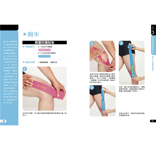 跑步是一項簡便且可以獨自進行的運動,但若不做任何準備就開始跑步,常常會造成膝蓋不適。因為在跑步時所產生的地面反作用力是行走時的2∼3倍,而跑步最常見的傷害部位就屬膝蓋。俗稱的「跑步膝」就是指膝蓋外側悶痛,特別是在下樓、跑下坡或是跑步膝蓋快伸直前。為了預防這樣的疼痛發生,我們可以用貼紮來放鬆大腿外側,並且加強大腿內側肌力,達到膝蓋內外拉力的平衡。