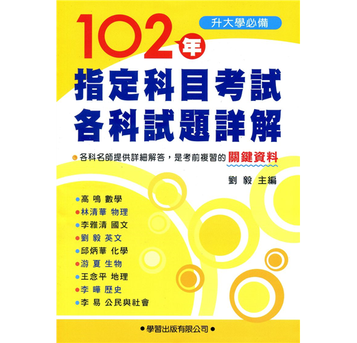 本書收集『102年指定考科』試題,由各科名師提供詳細解答,是考前複習的關鍵資料。書末整理有大考中心公佈之『選擇題答案』、『各科成績標準一覽表』、及各科『成績人數百分比累計表』,讓考生確切掌握考試脈動。