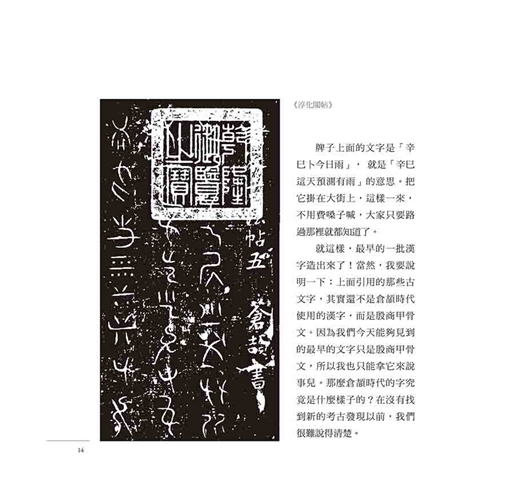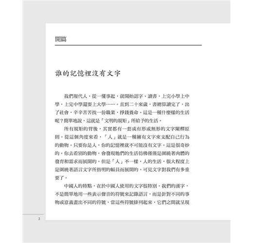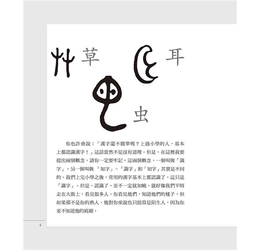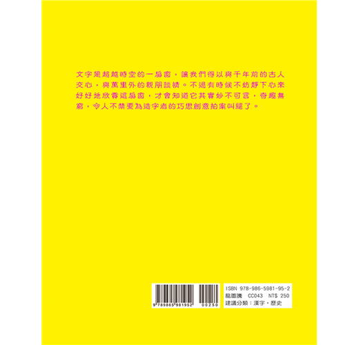 有別於一般說文解字的書籍,已故的龍子仲所寫的這本,係以輕鬆詼諧的語調,娓娓道來將近兩百個常用漢字的源流、演變,以及可能的造字概念發想──古人在創造文字時,究竟是怎麼構思的。